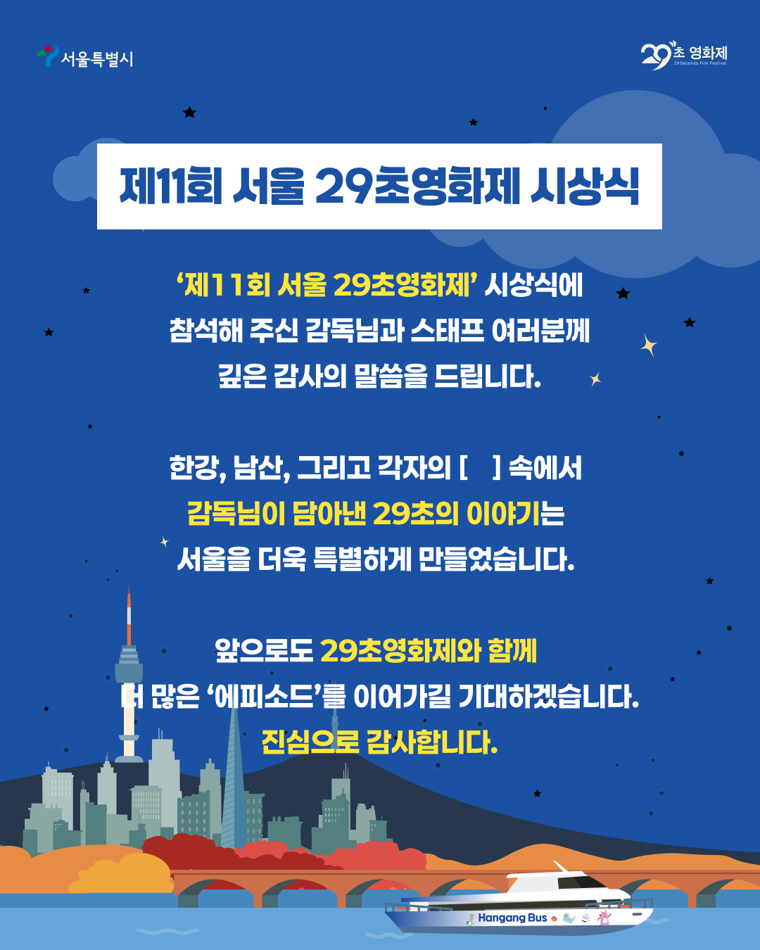 29초영화제(이하 '회사')는 고객님의 개인정보를 중요시하며, "정보통신망 이용촉진 및 정보보호"에 관한 법률을 준수하고 있습니다. 회사는 개인정보처리방침을 통하여 고객님께서 제공하는 개인정보가 어떠한 용도와 방식으로 이용되고 있으며, 개인정보보호를 위해 어떠한 조치가 취해지고 있는지 알려드립니다. 회사는 개인정보처리방침을 개정하는 경우 웹사이트 공지사항(또는 개별공지)을 통하여 공지할 것입니다.